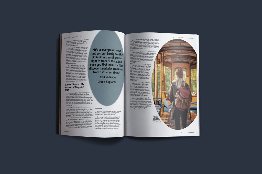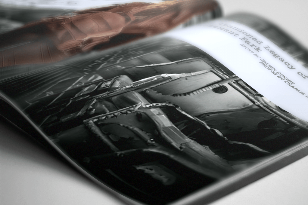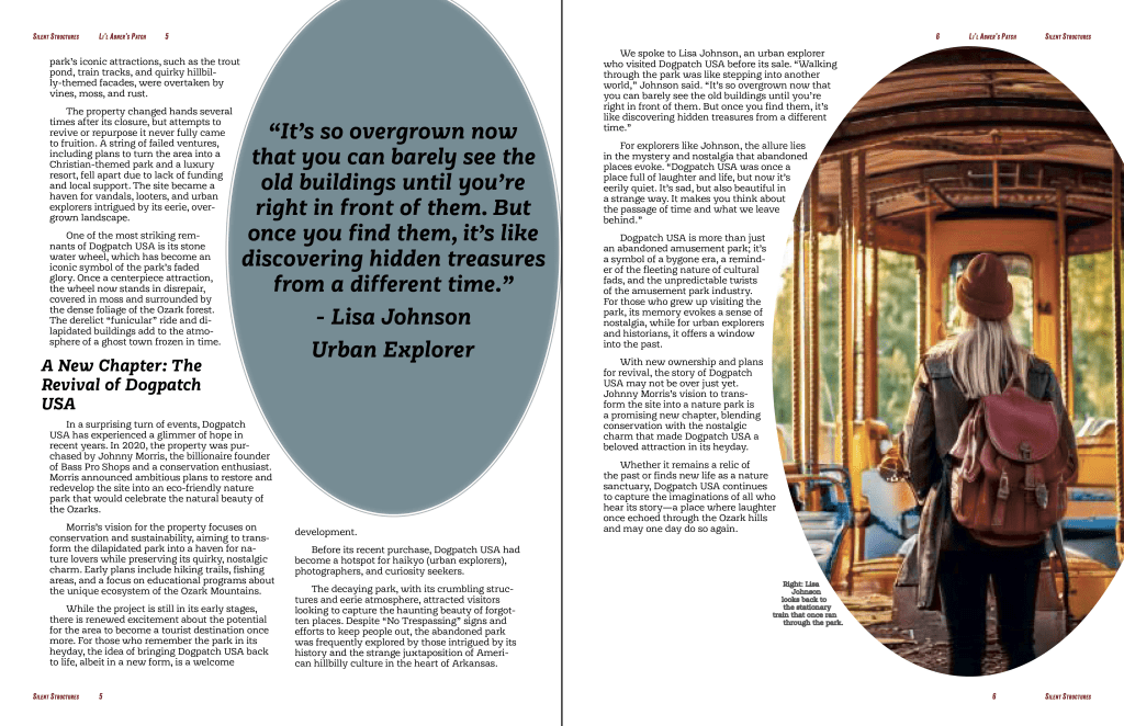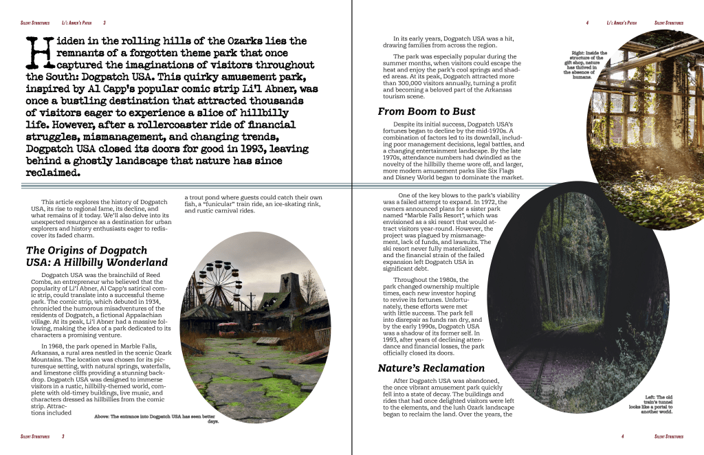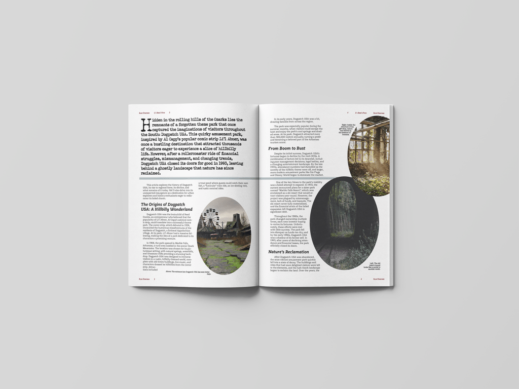 Li’l Abner’s Patch: 6 page spread example from a magazine with curated photos. The magazine focused on urban exploration and was themed for abandoned amusement parks.