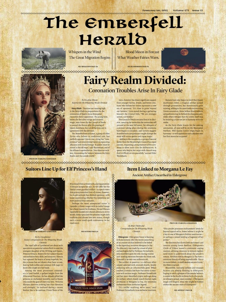 The Emberfell Herald: A newspaper spread example with curated photos. The newspaper was created to be a fantasy themed publication.
